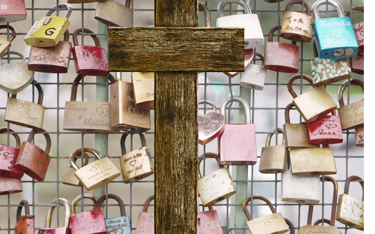 They hang there, Day and night, Night and day; Rain and sun, Sun and rain; Through every season. Through every year. Padlocks! Hanging on bridges, Locked in time. Each one tells a story; Known only To those who threw Away the key; Declaring their love. He hung on a cross; Only a few hours; Declaring his love, Forever. A love… Deep enough, Wide enough, Long enough, High enough, For all humanity,, For all time, For beyond time, Locked for eternity.