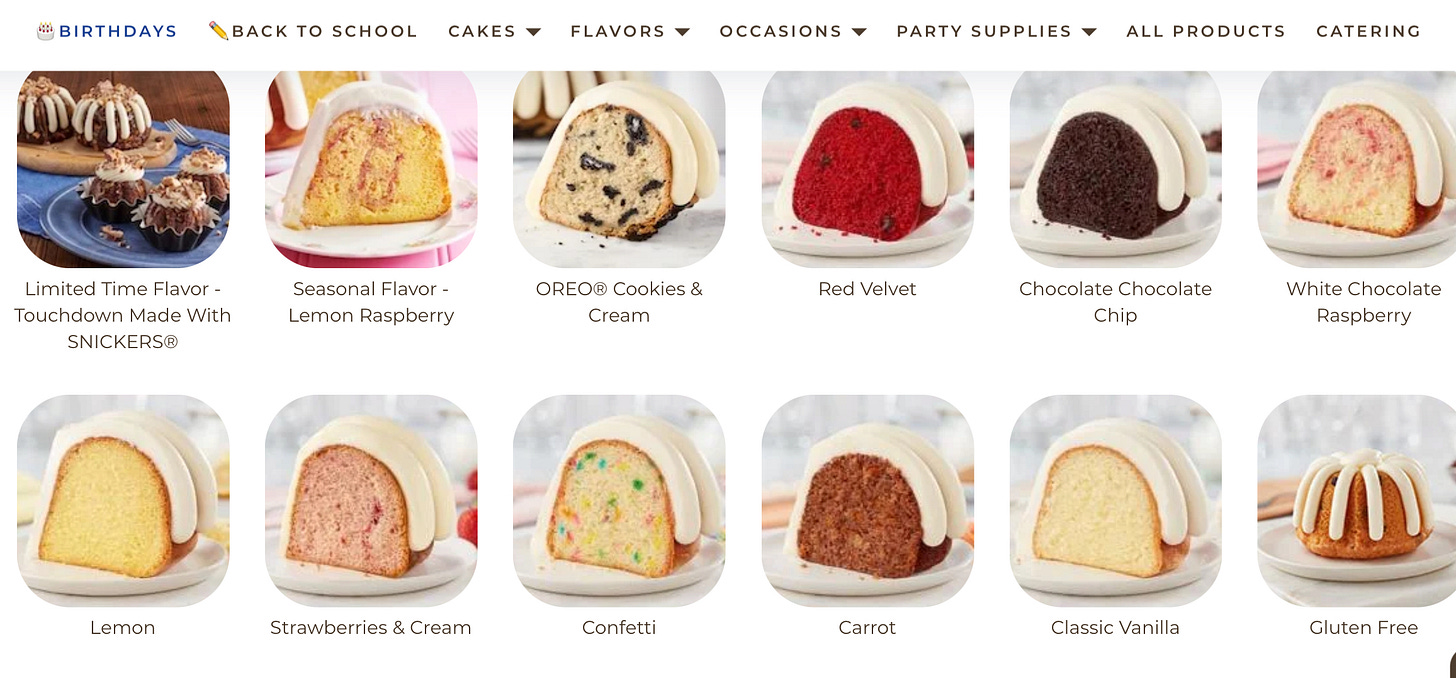 But let’s return to the story of Nothing Bundt Cakes. They only do one thing - bake bundt cakes! But looking at the picture below from their website, it’s obvious that all bundt cakes are not alike.